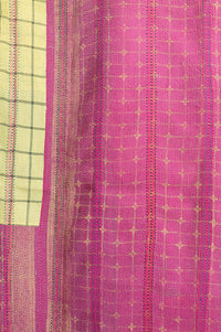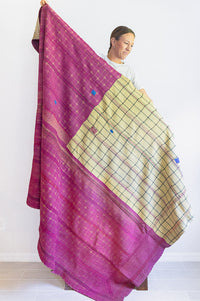 The size of this blanket is approximately 90" x 62.5". This medium-weight beauty has a soft yet sturdy feel—perfect for cozy layering or a bedding statement piece. It features a satin, shimmery border, usually seen on wedding or special occasion sarees. Traditional Bengali stitching runs through a striking vibrant fuchsia and array of neutrals.