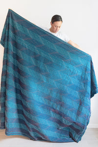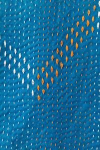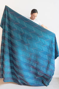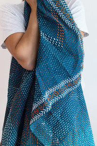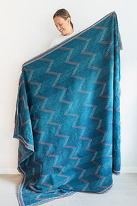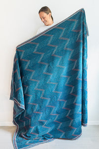 The size of this blanket is approximately 99.5" x 73". This beauty is lightweight and soft in the most gorgeous teal sapphire shade. It features traditional Bengali zigzag and diagonal stitching, finished with a hand-stitched border.