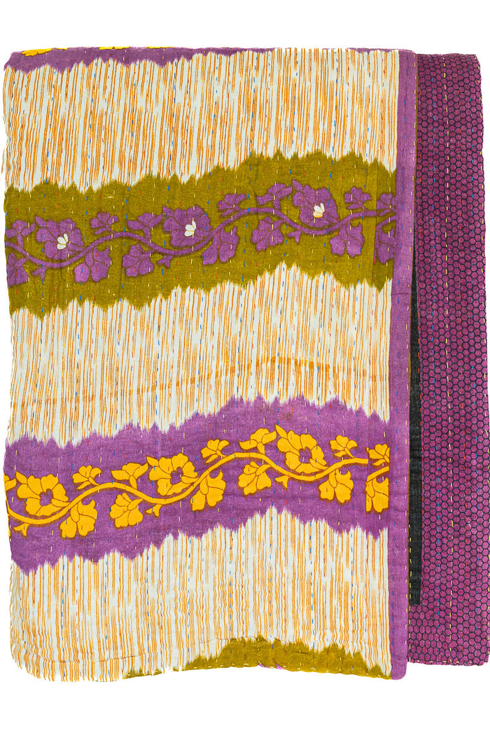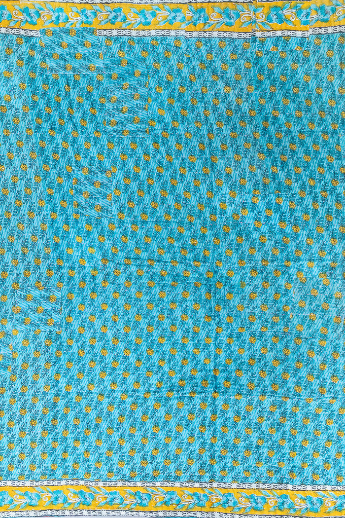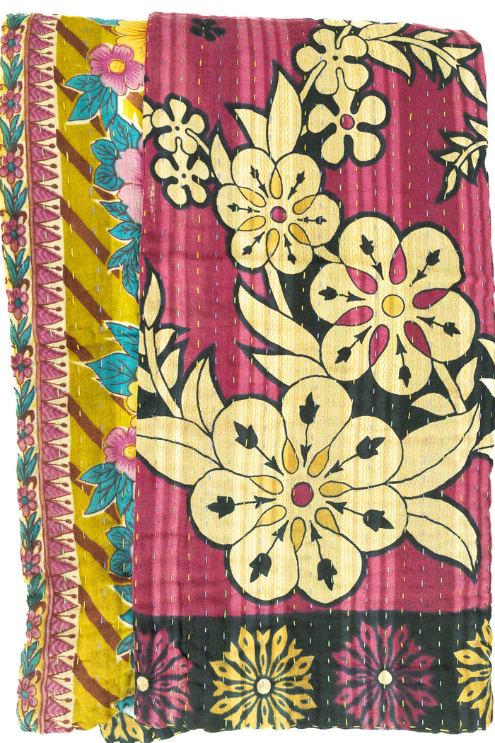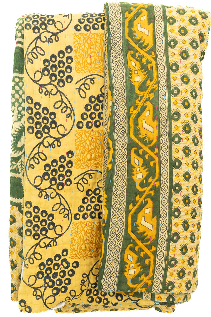 Our “classic cotton throw blankets” ($98) are our bestselling, multipurpose throw. They are long and lean (3.25 feet x 6.5 feet), with two different patterns, one on each side. Sometimes we have 2 of a kind, because there is enough sari cloth to make two from each pair of saris. These are named “Xyz Kantha Throw”.