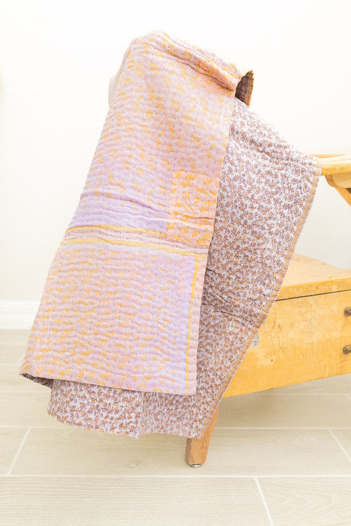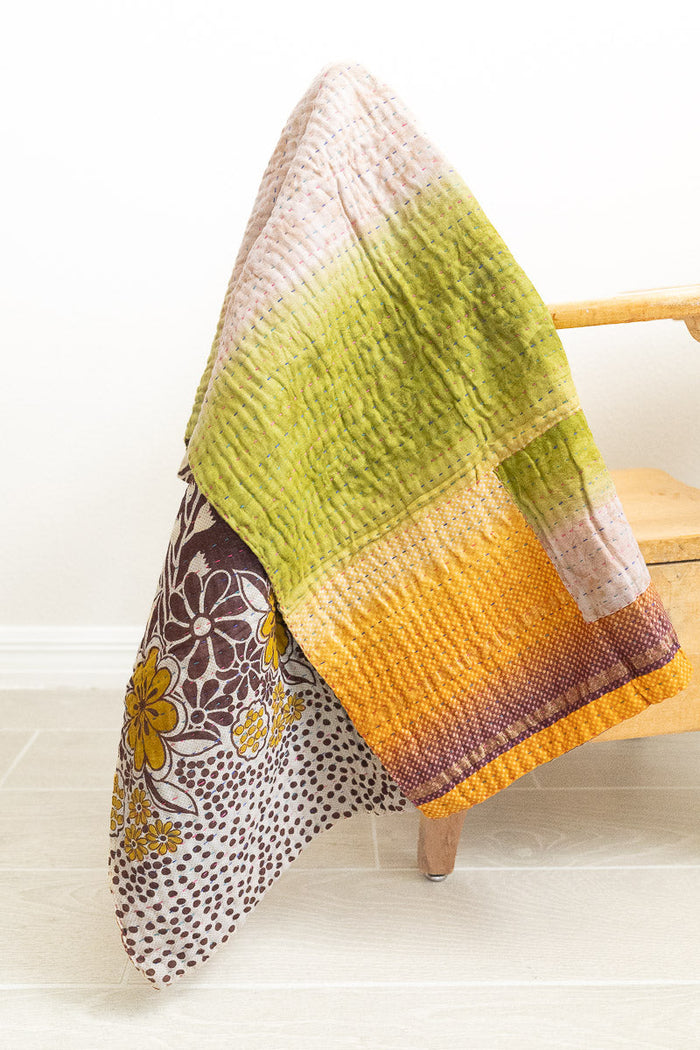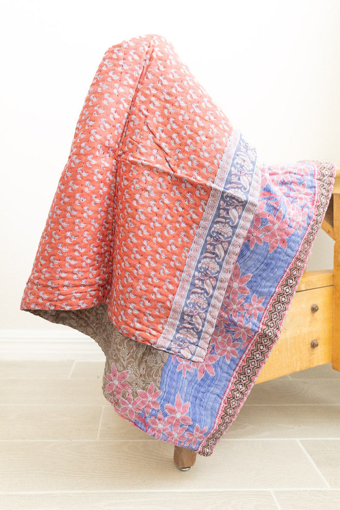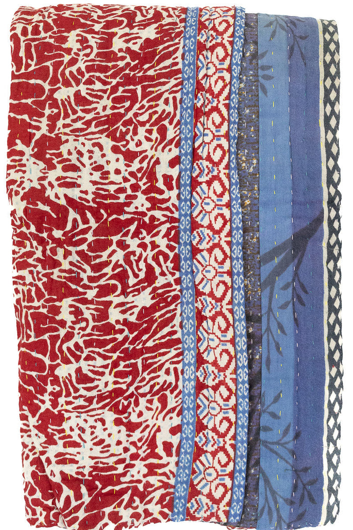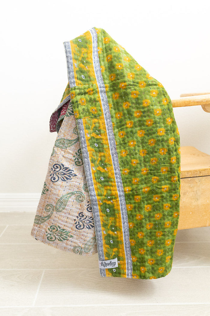 Our “classic cotton throw blankets” ($98) are our bestselling, multipurpose throw. They are long and lean (3.25 feet x 6.5 feet), with two different patterns, one on each side. Sometimes we have 2 of a kind, because there is enough sari cloth to make two from each pair of saris. These are named “Xyz Kantha Throw”.