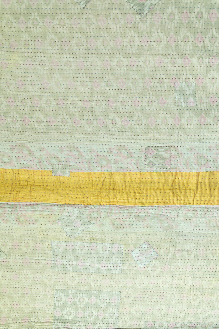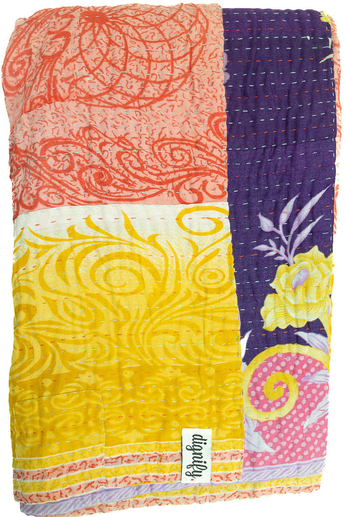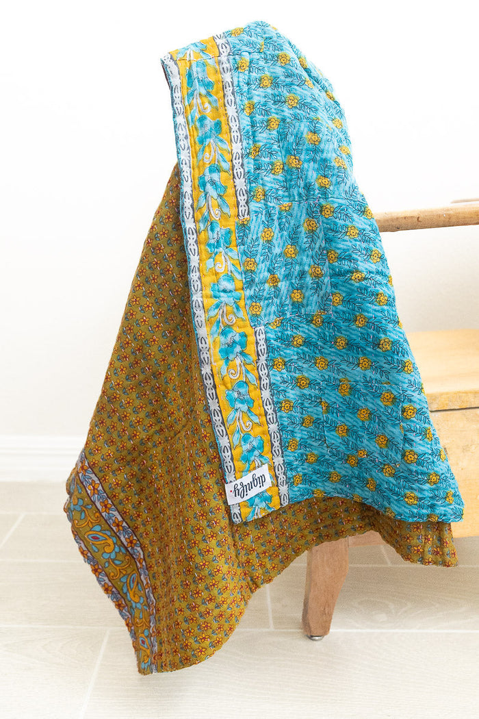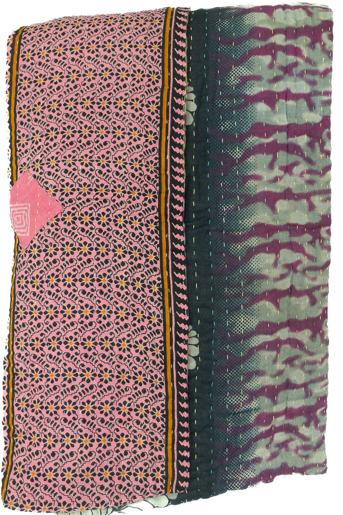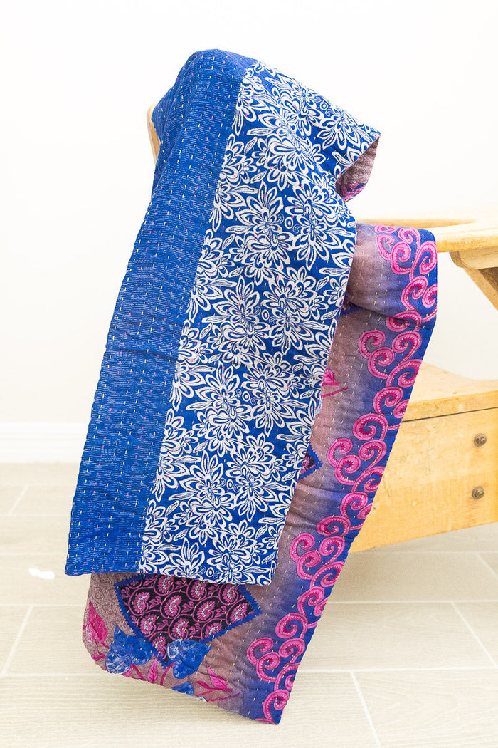 Large throws (“Xyz No. 1 Kantha Large Throw”, $196) are twice the size of a classic throw, and are square in shape. They are made from 2 full saris, one for each side. These ones are great for a warmer cuddle on the couch, or could work as a bed blanket for a twin or double bed (6.5 feet x 6.5 feet).