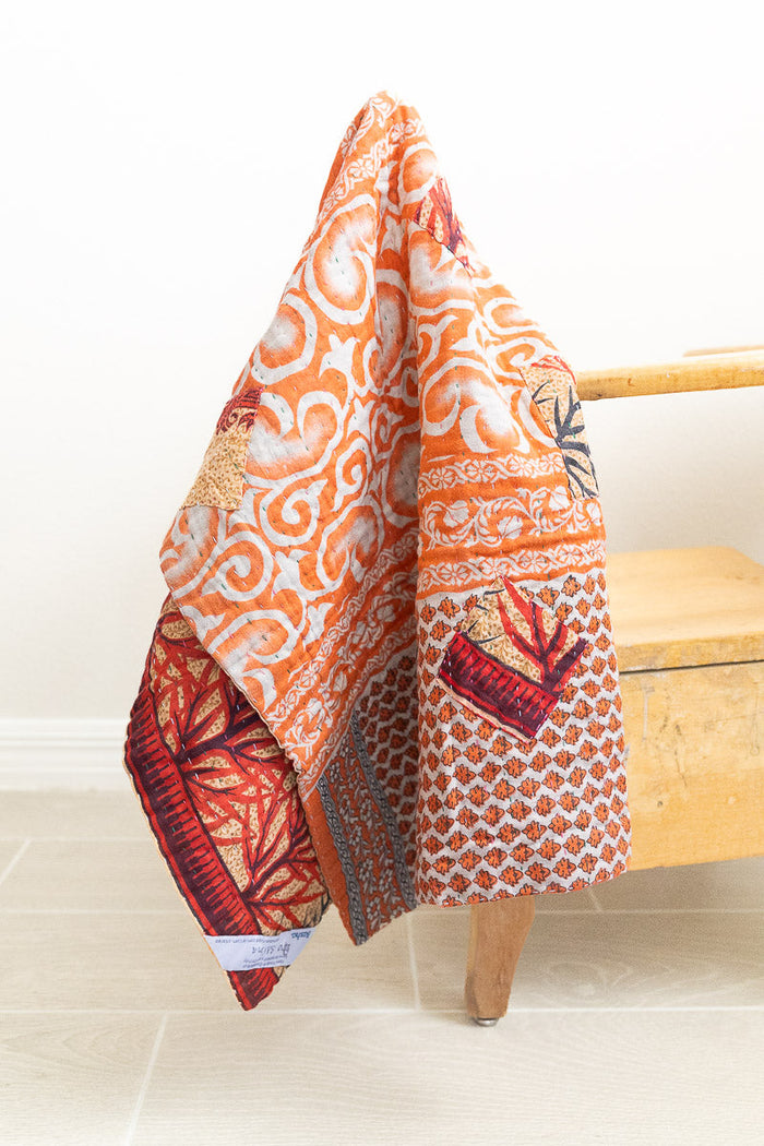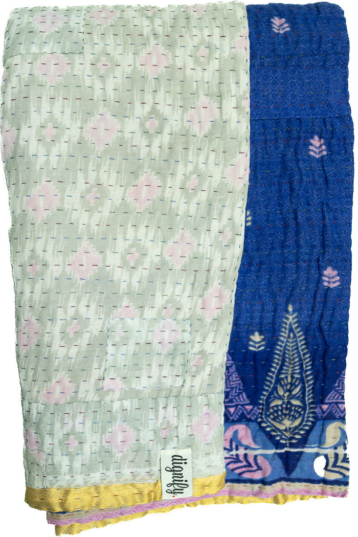 Mini blankets ($62) are small squares — half the size of a classic throw, or a quarter the size of a large throw. There can be up to 4 per style, but with variations on each. Many kantha minis are purchased as baby blankets, but also for lap blankets or decor. These are named “Xyz No. 1 Kantha Mini Blanket”.