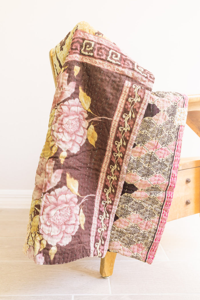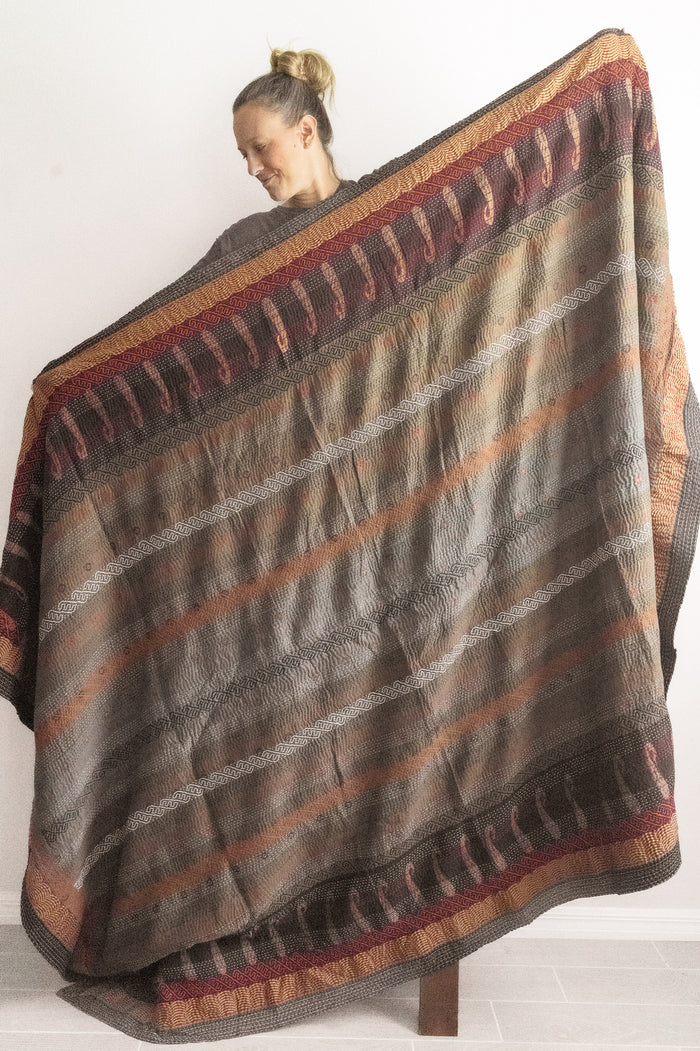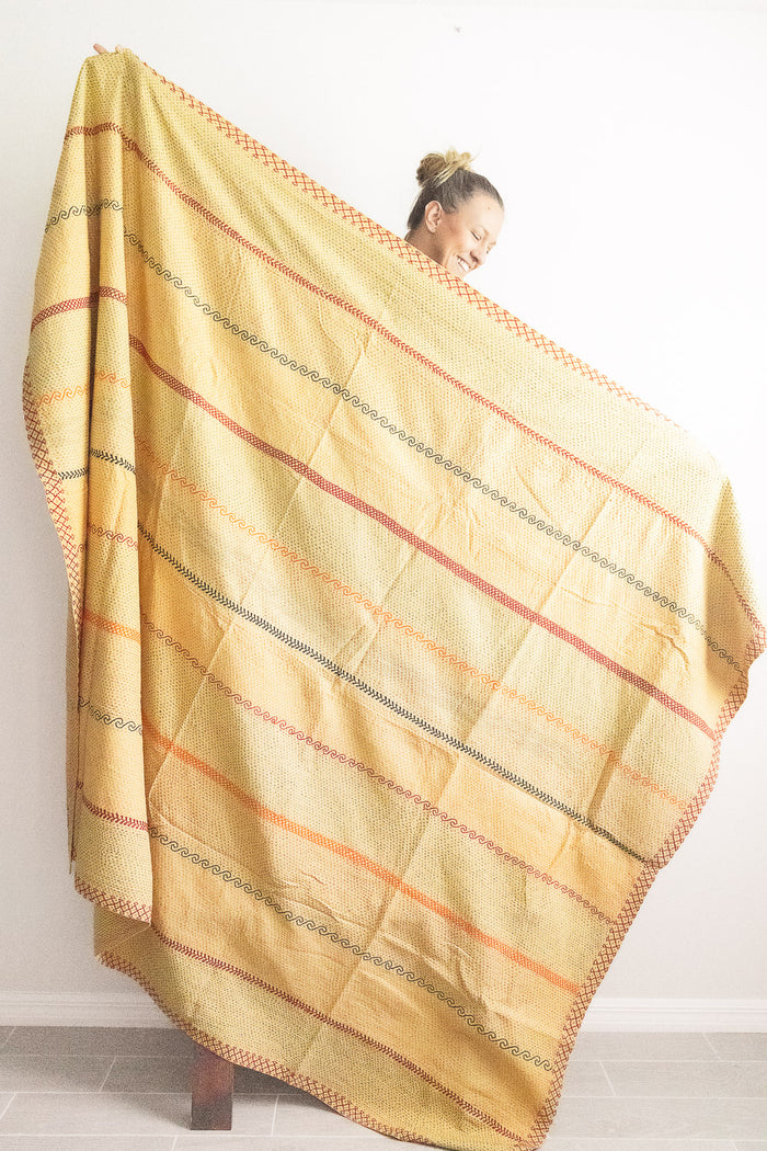 Masterpiece kantha quilts are made in the Northern style of the kantha tradition. The thread is thicker, the stitching denser, and you will see patterns & stitching embellishments that our classic blankets do not have. Our special kantha quilts range in prices and are true showpieces of art & kantha handicraft.