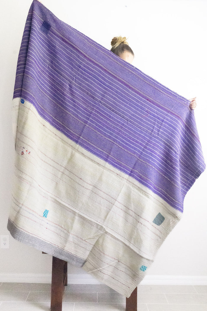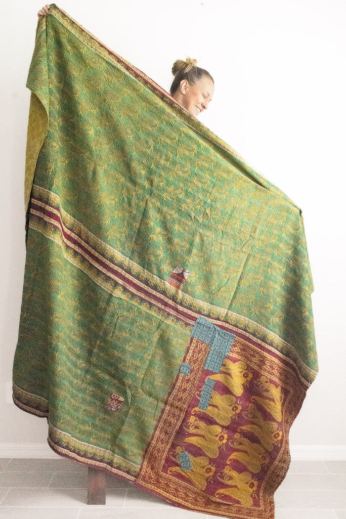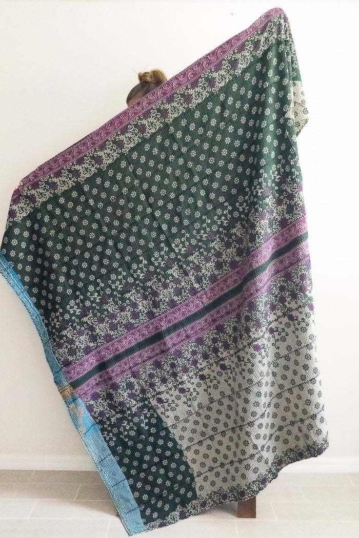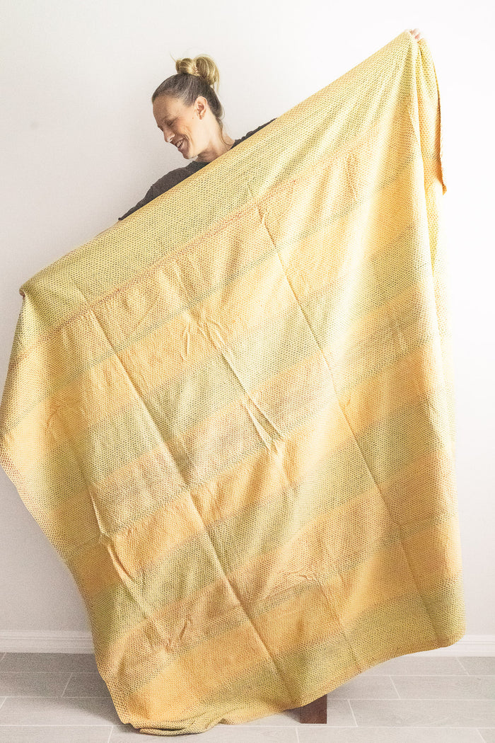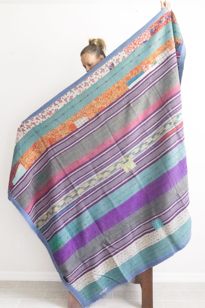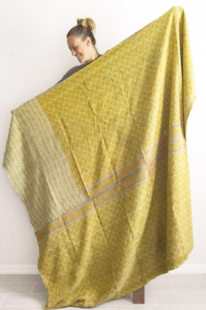 Large throws (“Xyz No. 1 Kantha Large Throw”, $196) are twice the size of a classic throw, and are square in shape. They are made from 2 full saris, one for each side. These ones are great for a warmer cuddle on the couch, or could work as a bed blanket for a twin or double bed (6.5 feet x 6.5 feet).