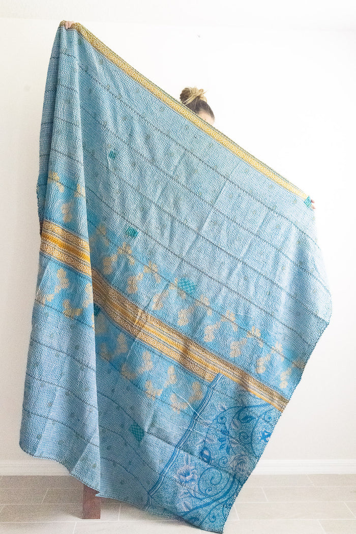 Silk blend throws ($138) are fancier, more elegant; these are made from special event saris (that you might picture someone wearing for a wedding). They often have gold or silver thread embellishment and tend to feel smoother. All silk blend throws are the same size as our classic throws: 3.25 feet x 6.5 feet. Spot cleaning or dry cleaning is recommended.