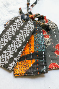 - Our kantha-stitched gift tags add thoughtfulness and meaning to every present. Each set of three (3) is made from reclaimed sari cotton, layered and hand-stitched using the traditional kantha stitch.